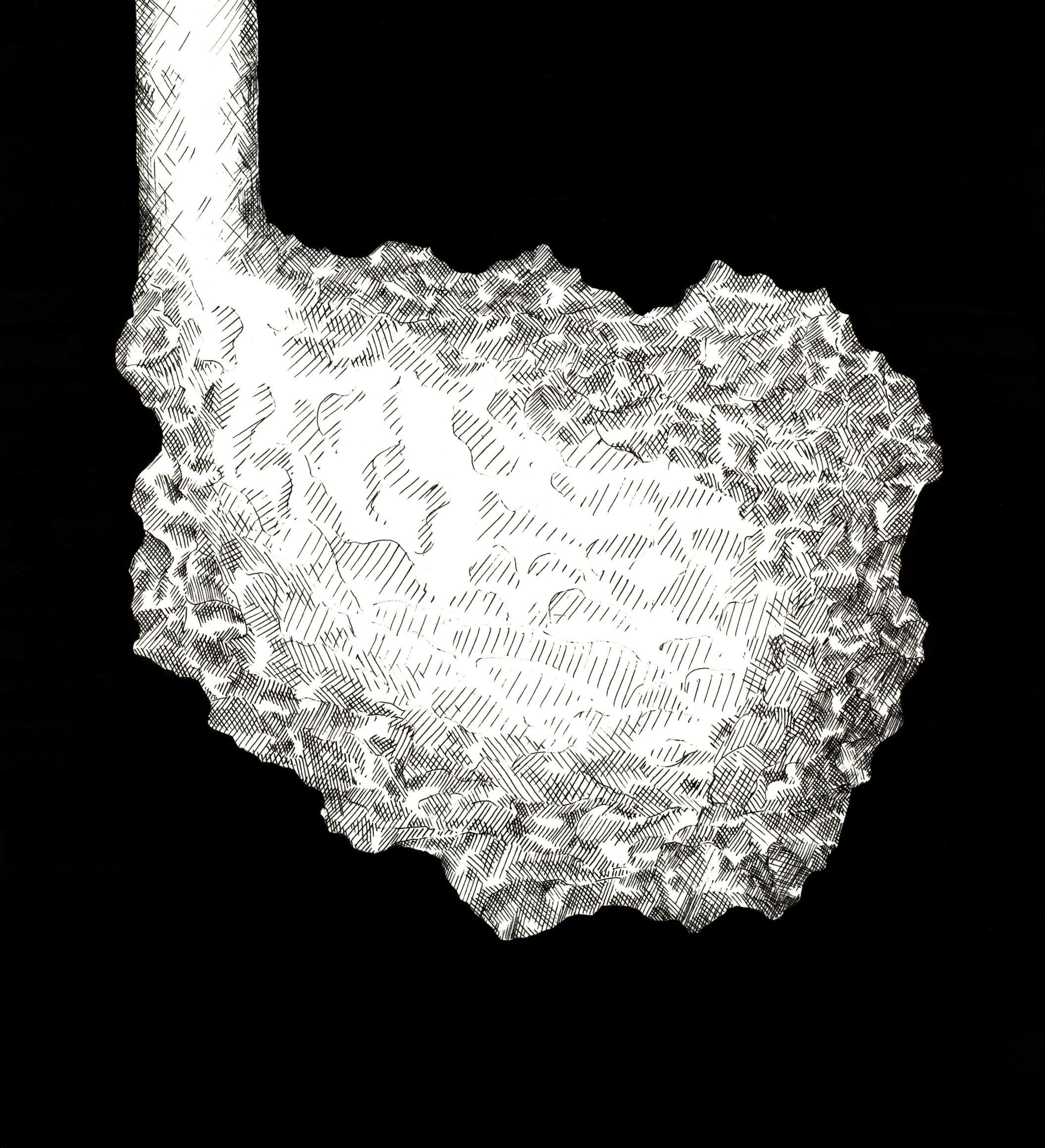 This project began by selecting two words: a “client” and a “program” (the space in which the client inhabits) from a provided list; I chose an astronomer as my client and a mine as my program. Next came three section drawings: a section of a room for an astronomer, a section of a mine, and a section of a room combining the two (or, an astronomer’s mine). My astronomer’s room focused on the immediate associations I had with the word—an oculus, rounded walls, strict geometries—while my mine was leaning into the organic and rough qualities of rock. Consequently, my third section had to consolidate contrasting elements, combining perfect geometries with organic shapes and smooth surfaces with rough textures. The cylindrical hollows piercing in from the outside create holes of light, creating constellations on the interior of the structure inspired by Étienne-Louis Boullée’s Cenotaph for Isaac Newton. The second half of this project was taking the third section with additional constraints and modifying it into a 9-inch-cube-sized model (with a scale of 1”:1’).
