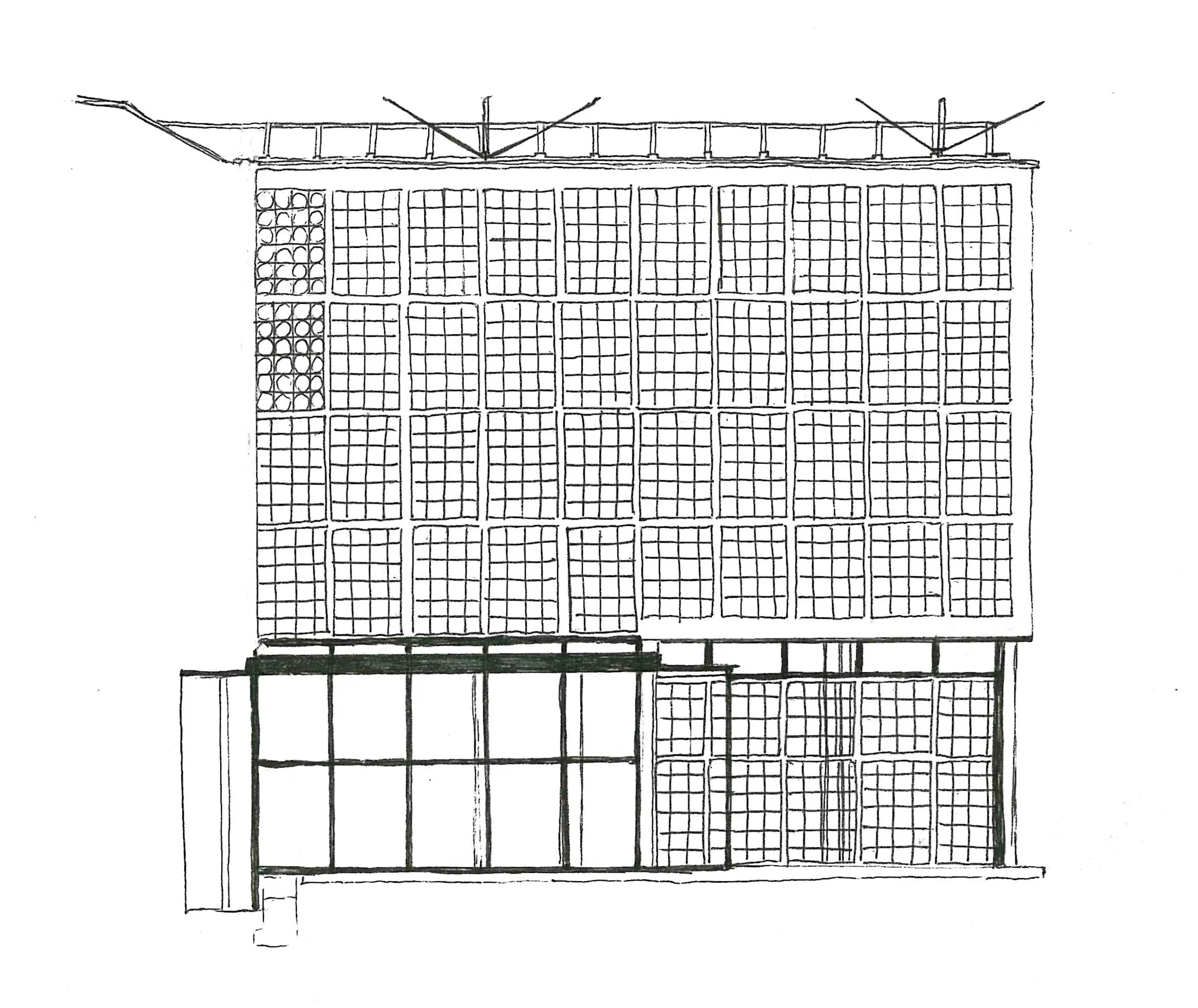 A series of analytical sketches and orthographic drawings of Maison de Verre, Pierre Chareau.