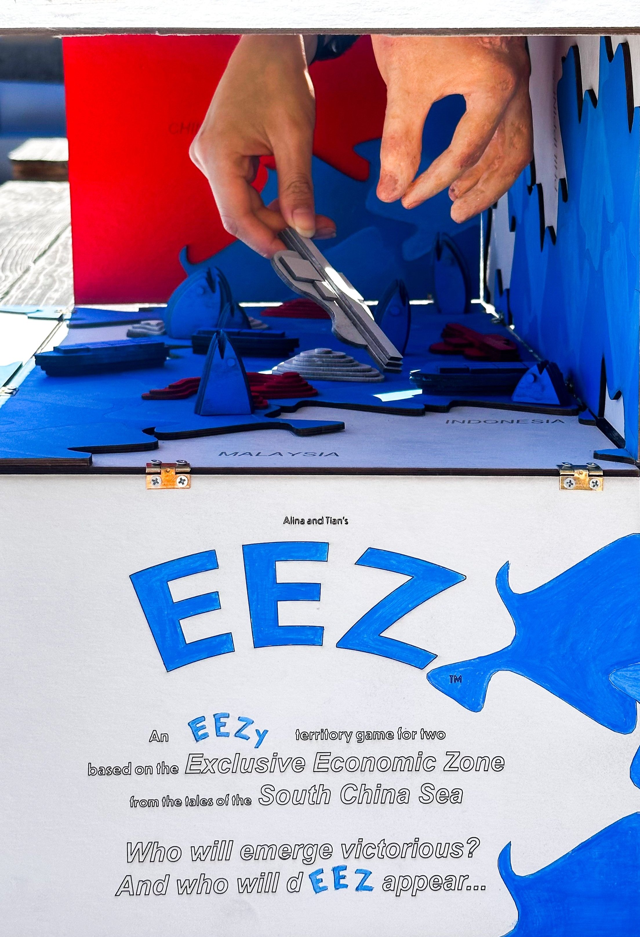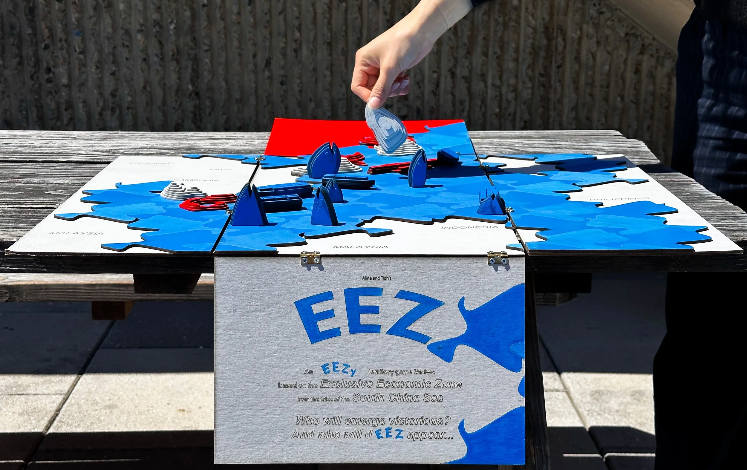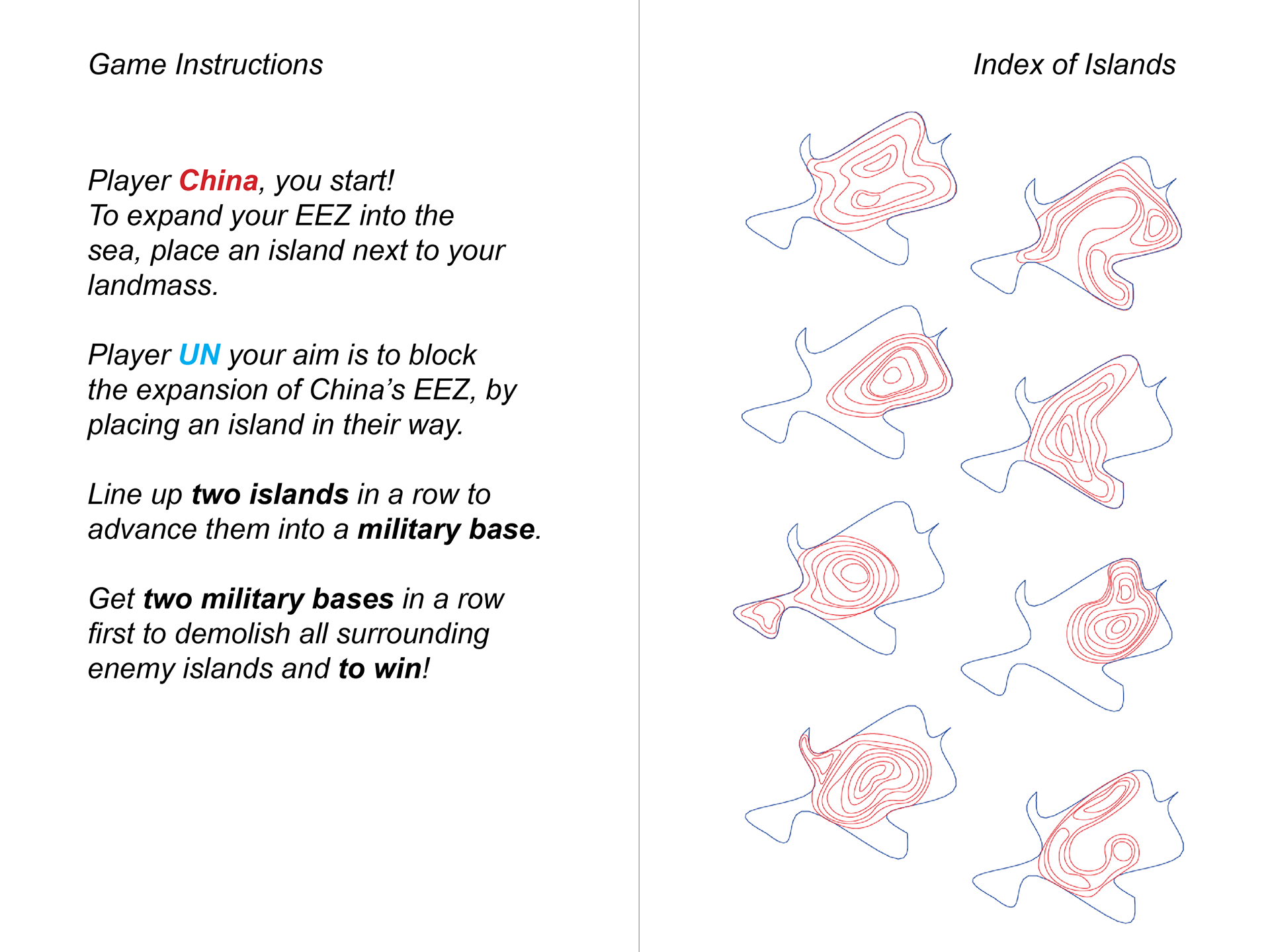To portray the territorial disputes in the South China Sea, or the Exclusive Economic Zone (EEZ), we wanted to show the physical and metaphorical manipulation of the islands in this area. As you look through the opening, China’s presence is glaring and obvious, representing her aggressive and imposing role in this dispute. The diorama unfolds, and as it does so reveals the other countries involved in the South China Sea conflict. These countries are China’s opponents both in real life and in this playable game.